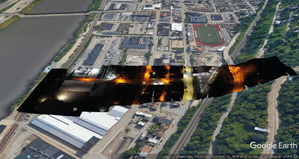 Dr. John Wenskovitch added a daytime image from Google Earth view to a drone photo of Southside in Pittsburgh taken Wednesday, October 16, 2019.